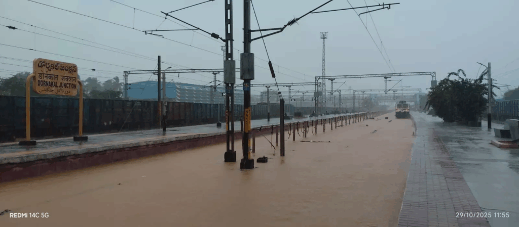 ఉత్తర వాయవ్య దిశగా కదులుతూ బలహీనపడుతున్నప్పటికీ మొంథా తుఫాను ప్రభావం తెలంగాణపై ఎక్కువగానే ఉంది. ముఖ్యంగా మహబూబాబాద్ జిల్లా వ్యాప్తంగా ఉదయం నుంచి ఎడతెరిపి లేకుండా కురుస్తున్న భారీ వర్షాల కారణంగా జిల్లాలోని ప్రధాన రైల్వే మార్గాలు, స్టేషన్లు జలమయమయ్యాయి. దీంతో పలు రైళ్ల రాకపోకలకు తీవ్ర అంతరాయం ఏర్పడింది. భారీ వర్షాల ధాటికి డోర్నకల్ రైల్వే జంక్షన్ వద్ద రైల్వే ట్రాక్లు పూర్తిగా నీట మునిగాయి. సుమారు 5 గంటల పాటు కురిసిన వర్షానికి వరద నీరు రైల్వే స్టేషన్లోకి భారీగా చేరింది. డోర్నకల్ జంక్షన్లో ఒకటో నంబర్ ప్లాట్ఫాంపైకి కూడా నీరు చేరింది. రైల్వే ట్రాక్లు నీటిలో మునిగిపోవడంతో, ప్రయాణికుల భద్రత దృష్ట్యా ముందుజాగ్రత్త చర్యగా పలు రైళ్లను జిల్లా పరిధిలోనే నిలిపివేశారు. దీంతో గుంటూరు నుంచి సికింద్రాబాద్కు వెళ్లే గోల్కొండ ఎక్స్ప్రెస్ను డోర్నకల్ రైల్వే స్టేషన్లో నిలిపివేశారు. ఇక సికింద్రాబాద్ నుంచి వరంగల్ మీదుగా విజయవాడ వెళ్లే రైళ్ల రాకపోకలు ఆలస్యం కానున్నట్లు వారు వెల్లడించారు.